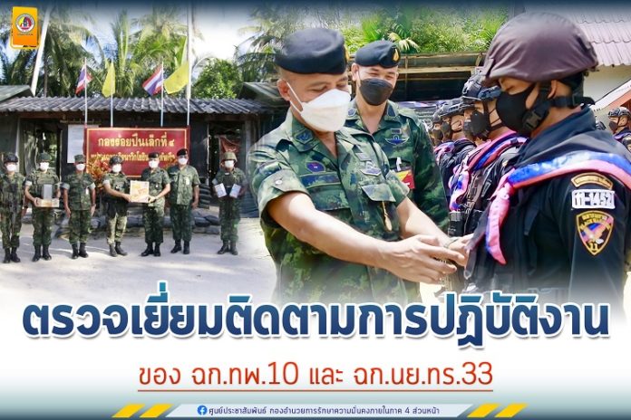 จากนั้นเวลา 13.30 น. รองผู้อำนวยการรักษาความมั่นคงภายในภาค 4 ส่วนหน้า พร้อมคณะ ลงพื้นที่ตรวจเยี่ยมติดตามการปฏิบัติงานของหน่วยเฉพาะกิจนาวิกโยธินกองทัพเรือที่ 33 โดยได้รับฟังการบรรยายสรุป การรักษาความปลอดภัยเมืองเศรษฐกิจในเขตอำเภอเมือง จังหวัดนราธิวาส, การปฏิบัติงานของหน่วย นอกจากนี้ยังได้ลงพื้นที่ไปตรวจเยี่ยมกำลังพลที่ปฏิบัติงานตามกองร้อยปืนเล็กหน่วยเฉพาะกิจนาวิกโยธินกองทัพเรือที่ 33 ประกอบด้วย กองร้อยปืนเล็กที่ 3 และ กองร้อยปืนเล็ก 4 เพื่อมอบสิ่งของบริโภค สร้างขวัญกำลังใจให้กับกำลังพล