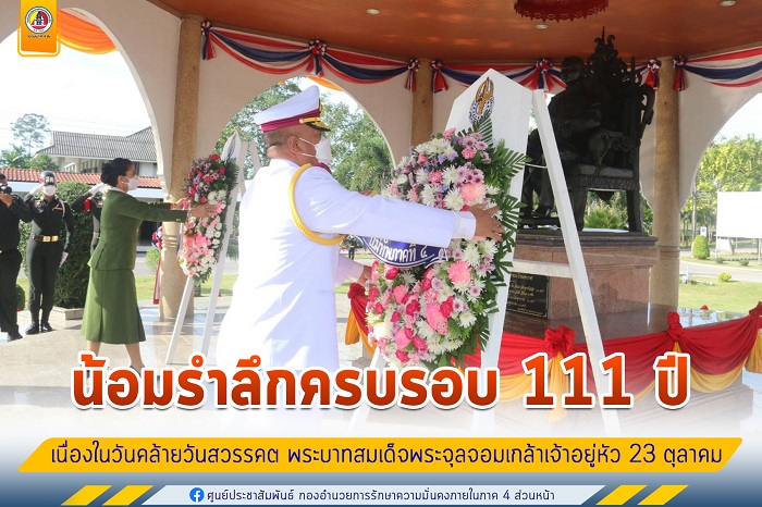 วันนี้ (23 ตุลาคม 2564) เวลา 08.30 น. ณ พระบรมรูปรัชกาลที่ 5 กองบัญชาการกองทัพภาคที่ 4 ค่ายวชิราวุธ อำเภอเมือง จังหวัดนครศรีธรรมราช พลโท เกรียงไกร ศรีรักษ์ แม่ทัพภาคที่ 4 พร้อมด้วย คุณคนึงนิตย์ ศรีรักษ์ ประธานสมาคมแม่บ้านทหารบก สาขากองทัพภาคที่ 4 เป็นประธานในพิธีน้อมรำลึกครบรอบ 111 ปี เนื่องในวันคล้ายวันสวรรคต พระบาทสมเด็จพระจุลจอมเกล้าเจ้าอยู่หัว เพื่อน้อมรำลึกถึงพระมหากรุณาธิคุณ และพระราชกรณียกิจของสมเด็จพระจุลจอมเกล้าเจ้าอยู่หัว หรือสมเด็จพระปิยมหาราช พระมหากษัตริย์ผู้เป็นที่รักยิ่งของปวงชนชาวไทยที่ทรงบำเพ็ญพระราชกรณียกิจนานัปการ เพื่อบำบัดทุกข์บำรุงสุขแก่ปวงชนชาวไทย ตั้งแต่เถลิงถวัลยราชสมบัติ จนกระทั่งเสด็จสวรรคตในวันที่ 23 ตุลาคม ทั้งนี้ได้กล่าวถวายพระเกียรติคุณ และวางพวงมาลา ถวายราชสักการะพระบรมรูป รัชกาลที่ 5 โดยมี ผู้บังคับบัญชาชั้นสูง เหล่าสมาคมแม่บ้านทหารบก และกำลังพลเข้าร่วมพิธีอย่างพร้อมเพรียง ภายใต้มาตรการป้องกันการแพร่ระบาดของเชื้อไวรัส covid-19 อย่างเคร่งครัด