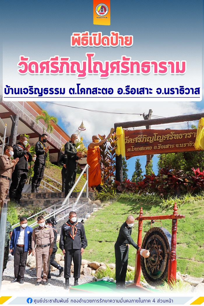 วันนี้ (23 ตุลาคม 2564 ) เวลา 09.39 น. ที่วัดศรีภิญโญศรัทธาราม บ้านศรีภิญโญ หมู่ที่ 6 ตำบลโคกสะตอ อำเภอ รือเสาะ จังหวัดนราธิวาส พลตรี เฉลิมพร ขำเขียว ผู้บัญชาการกองพลทหารราบที่15 / ผู้อำนวยการศูนย์ประสานงานโครงการอันเนื่องมาจากพระราชดำริ เป็นผู้แทน พลโท เกรียงไกร ศรีรักษ์ แม่ทัพภาคที่4 / ผู้อำนวยการรักษาความมั่นคงภายในภาค 4 เป็นประธานฝ่ายฆราวาส พิธีเปิดป้ายวัดศรีภิญโญศรัทธาราม พร้อมทั้งร่วมพิธีสักการะเจริญพระพุทธมนต์ และพิธีจัดประกาศตราตั้งวัด มอบใบตราตั้งจากสำนักงานพระพุทธศาสนาแห่งชาติ และพิธีสมโภชองค์กฐินสามัคคีประจำปี 2564 โดยมี พระครู พระครูสุนทรธรรมมาวัตร รักษาการเจ้าคณะอำเภอ จังหวัดนราธิวาส / เจ้าอาวาสวัดสวนธรรม เป็นประธานฝ่ายสงฆ์ ซึ่งมี นายกิตติศักดิ์ แซ่โค้ว ผู้แทนผู้อำนวยการสำนักงานพระพุทธศาสนาแห่งชาติ, เจ้าหน้าที่ทหาร, ตำรวจ, ผู้นำท้องที่, ผู้นำท้องถิ่น, ส่วนราชการ และพี่น้องประชาชนในพื้นที่เข้าร่วม โดยพิธีดังกล่าวจัดขึ้นภายใต้มาตรการการป้องกันการแพร่ระบาดเชื้อไวรัสโควิด-19 อย่างเคร่งครัด