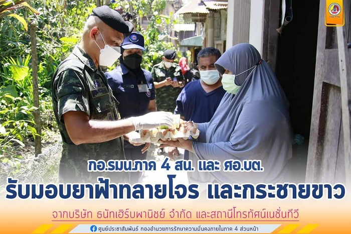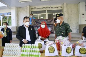 เมื่อ (23 ตุลาคม 2564) เวลา 10.30 น. ที่ หน้าอาคารศูนย์อำนวยการบริหารจังหวัดชายแดนภาคใต้ อำเภอเมือง จังหวัดยะลา พลตรี อุทิศ อนันตนานนท์ รองผู้อำนวยการรักษาความมั่นคงภายในภาค 4 ส่วนหน้า พร้อมด้วยพลเรือตรี สมเกียรติ ผลประยูร เลขาธิการศูนย์อำนวยการบริหารจังหวัดชายแดนภาคใต้ เป็นประธานในการรับมอบยาแคปซูลฟ้าทลายโจร จำนวน 5,000 ขวด และกระชายขาว จำนวน 3,000 ขวด พร้อมทั้งเครื่องบริโภค จาก เจ้าคณะจังหวัดหนองคาย, บริษัท ธนัทเฮิร์บพานิชย์ จำกัด และสถานีโทรทัศน์เนชั่นทีวี เพื่อนำไปแจกจ่ายให้กับประชาชนในพื้นที่จังหวัดชายแดนภาคใต้ ในการเฝ้าระวังยับยั้ง ป้องกันการแพร่ระบาดของเชื้อไวรัสโควิด-19 ในพื้นที่