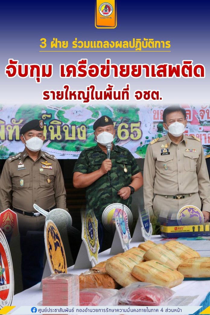ด้านขบวนการค้ายาเสพติดและการป้องกัน ทั้งรายใหญ่และรายย่อยในชุมชน ได้มีการบูณรณาการกำลังทุกภาคส่วน ทั้งทหาร, ตำรวจ, DSI, ปปส. และฝ่ายปกครองรวมทั้งพี่น้องประชาชนที่ได้ร่วมแจ้งเบาะแส จนนำไปสู่กระบวนการจักุมตามกฎหมาย เช่นเดียวกับครั้งนี้ที่สามารถจับคุมขบวนค้ายาเสพติดรายใหญ่ ส่วนรายย่อยในชุมชนได้สั่งการให้หน่วยเฉพาะกิจในแต่ละพื้นที่ดำเนินการมาอย่างต่อเนื่อง รวมถึงในเรื่องของการบำบัดรักษาเรายังคงใช้ Camp 35 และกระบวนการ CBTX หรือชุมชนบำบัด ที่ได้ดำเนินการมาอย่างต่อเนื่อง และจะดำเนินการขยายออกไปให้ครอบคลุมทุกอำเภอทุกตำบลหมู่บ้านให้มีศูนย์บำบัดยาเสพติด ซึ่งที่เป็นที่ต้องการของประชาชน โดยมีผู้นำศาสนา ผู้นำท้องที่ ผู้นำท้องถิ่น เข้ามามีส่วนช่วยนำบุตรหลานเข้ารับการบำบัดยาเสพติดให้กลับเป็นคนดีสู่สังคม ซึ่งเป็นไปตามนโยบายเร่งด่วนที่สำคัญยิ่งของกองอำนวยการรักษาความมั่นคงภายในภาค 4 ส่วนหน้า ที่พร้อมยืนหยัดในการดำเนินการ ตามนโยบายการแก้ไขปัญหายาเสพติด ทั้งด้านการป้องกันและการปราบปราม รวมถึงการบำบัดรักษาควบคู่กัน