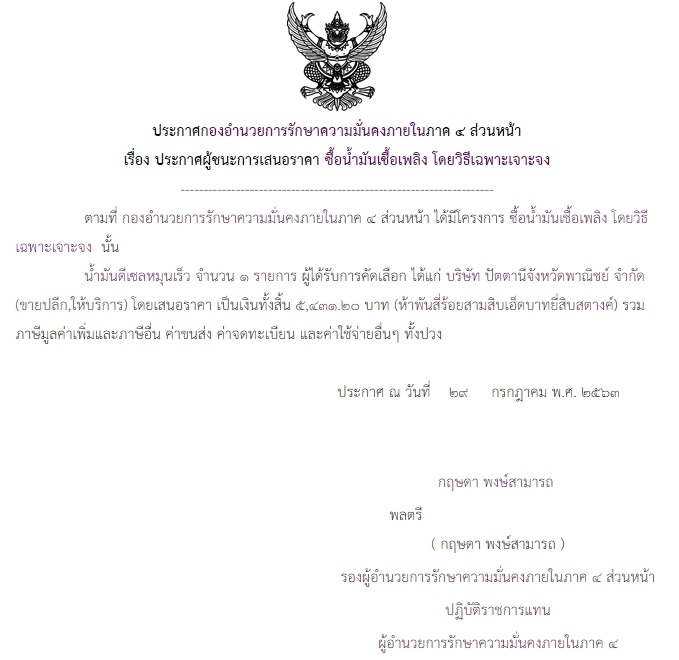 จัดซื้อ จัดจ้างประกาศผู้ชนะการเสนอราคา ประกาศผู้ชนะการเสนอราคา ซื้อน้ำมันเชื้อเพลิง โดยวิธีเฉพาะเจาะจง (5,431.20) August 10, 2020 880 Share Facebook Twitter Google+ Telegram LINE สบป.กอ.รมน.ภาค 4 สน.