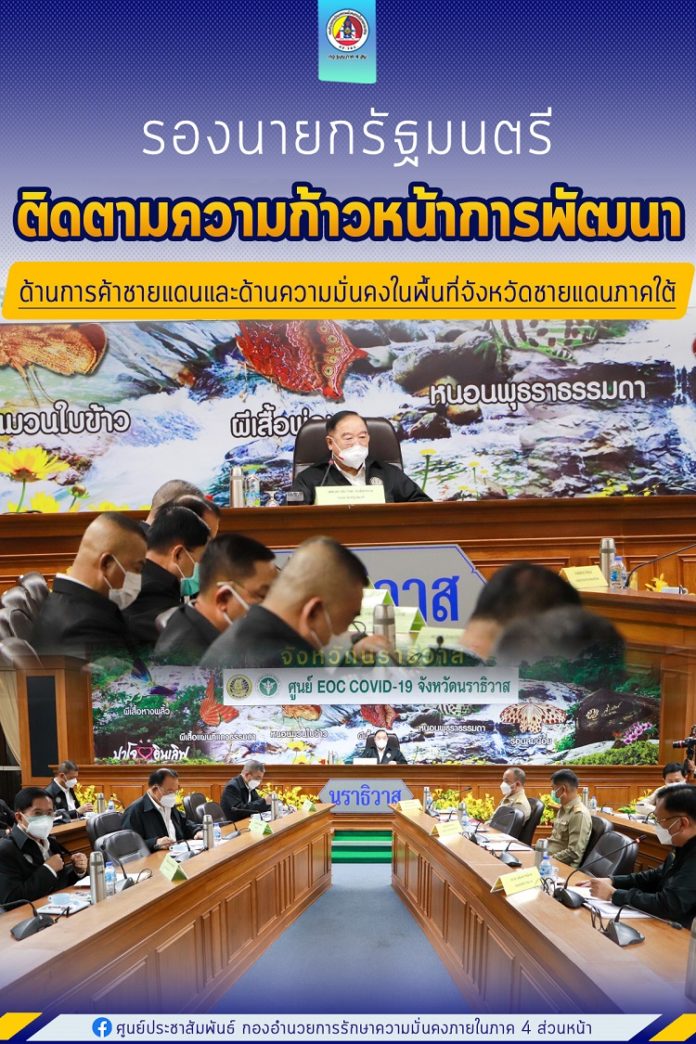 โดยการประชุมดังกล่าว ได้รายงานสรุปภาพรวมความก้าวหน้าการพัฒนาด่านการค้าชายแดนในพื้นที่จังหวัดนราธิวาส, รายงานสรุปการบริหารจัดการด่านและข้อเสนอการบริหารจัดการ ด่านในพื้นที่จังหวัดนราธิวาส (ด่านตากใบ ด่านบูเก๊ะตา และด่านสุไหงโก-ลก) พร้อมทั้ง รับฟังข้อเสนอแนะ และแนวทางการแก้ไขปัญหาความเดือดร้อนของประชาชนในพื้นที่จังหวัดชายแดนภาคใต้ และการทำงานของส่วนราชการ ต่าง ๆ ในพื้นที่จังหวัดชายแดนภาคใต้ พร้อมกับกล่าวมอบนโยบายให้คำแนะนำข้อสั่งการ แก่หน่วยงานทุกหน่วยเพื่อนำไปขับเคลื่อนสู่การปฏิบัติให้เป็นผลรูปธรรมโดยได้เน้นย้ำให้ทุกภาคส่วนบูรณาการทำงานให้ครอบคลุมประสานงานกับหน่วยงานที่เกี่ยวข้อง เพื่อขับเคลื่อนการแก้ไขปัญหาและการพัฒนาพื้นที่ ตลอดจนการประสานความร่วมมือกับหน่วยงานด้านความมั่นคงในเรื่องของการรักษาความปลอดภัยในชีวิตและทรัพย์สิน ทั้งนี้เพื่อความสงบสุขในพื้นที่ พี่น้องประชาชนในพื้นที่อยู่ดีกินดี และมีคุณภาพชีวิตที่ดีขึ้น