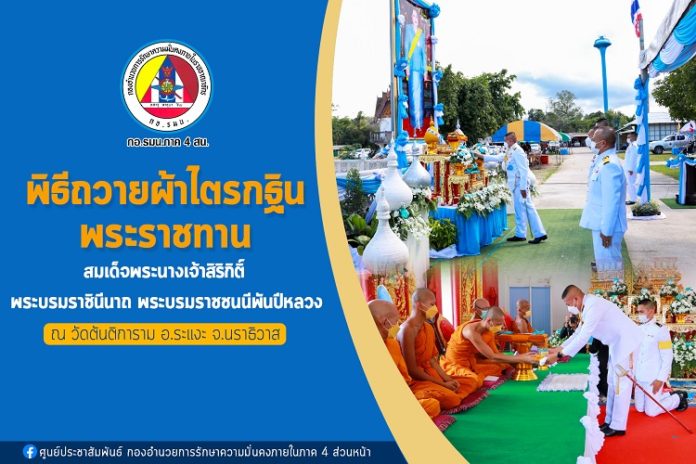 ทั้งนี้ พิธีถวายผ้าไตรกฐินพระราชทาน สมเด็จพระนางเจ้าสิริกิติ์ พระบรมราชินีนาถ พระบรมราชชนนีพันปีหลวง ประจำปี 2564 ในพื้นที่จังหวัดชายแดนภาคใต้ กองอำนวยการรักษาความมั่นคงภายในภาค 4 ส่วนหน้า ได้กำหนดพิธีเชิญผ้าไตรกฐินพระราชทานทอดถวายแด่วัดในพื้นที่จังหวัดชายแดนใต้ จำนวน 4 วัด ประกอบด้วย วัดน้ำขาวนอก อำเภอจะนะ จังหวัดสงขลา, วัดชมพูสถิต อำเภอเมือง จังหวัดยะลา, วัดตันติการาม อำเภอระแงะ จังหวัดนราธิวาส และ วัดยานิการาม อำเภอหนองจิก จังหวัดปัตตานี เพื่อเป็นการทำนุบำรุง สืบสานวัฒนธรรมขนบธรรมเนียมประเพณีในพระพุทธศาสนา ตลอดจนเพื่อสร้างความสามัคคีในหมู่คณะสงฆ์ อันเป็นการปฏิบัติตามประเพณีในพุทธบัญญัติ ที่ถือได้ว่าเป็นกาลทานมีผลอานิสงค์มากให้มีความเจริญรุ่งเรืองงดงามสืบไป
