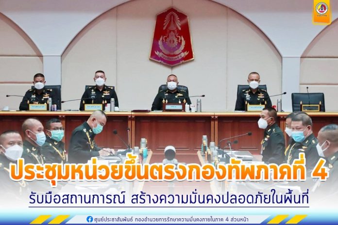 สำหรับการประชุมหน่วยขึ้นตรงกองทัพภาคที่ 4 ในวันนี้ แม่ทัพภาคที่ 4 ได้เน้นย้ำนโยบายที่สำคัญให้กับผู้บังคับหน่วยขึ้นตรงกองทัพภาคที่ 4 ว่า “ให้ทุกหน่วย ตั้งใจปฏิบัติงานในหน้าที่และเขตรับผิดชอบของตนเองให้เต็มกำลังความสามารถ ติดตามสถานการณ์บ้านเมืองอย่างใกล้ชิด เพื่อวางแผนการปฏิบัติต่างๆ ได้อย่างทันท่วงที ปฏิบัติภารกิจด้วยความละเอียด รอบคอบ สอดคล้องกับนโยบายของหน่วยเหนือ ควบคู่กับรักษามาตรการการป้องกันการแพร่ระบาดของไวรัส covid-19 อย่างเคร่งครัด โดยเฉพาะในห้วงของการฝึกทหารใหม่ ผู้บังคับหน่วยทุกระดับจะต้องกำกับดูแล การปฏิบัติให้เป็นไปด้วยความเรียบร้อย ยึดถือตามมาตรการต่างๆ ที่กองทัพบกกำหนด ดูแลด้านสิทธิ เสริมสร้างขวัญกำลังใจให้รู้สึกอบอุ่นเหมือนเป็นบ้านหลังที่ 2 นอกจากนั้นแล้วในห้วงระหว่างเดือนพฤศจิกายนไปจนถึงปลายเดือนธันวาคม ภาคใต้อยู่ในห้วงของฤดูมรสุมขอให้ทุกหน่วยเตรียมความพร้อมในการบรรเทาภัยพิบัติให้กับพี่น้องประชาชนในพื้นที่ เป็นแกนนำให้ภาคส่วนต่างๆ พร้อมให้การสนับสนุนในทุกเมื่อทุกโอกาส โดยไม่ต้องรอคำสั่ง สำหรับการรักษาความมั่นคงปลอดภัยนั้น ขอให้หน่วยในพื้นที่กวดขันเรื่องระเบียบวินัย ไม่ปล่อยปละละเลยในหน้าที่ทำให้เกิดเหตุการณ์สูญเสีย ปรับแผนให้ปฏิบัติการเชิงรุกเพิ่มมากขึ้น สร้างความเชื่อมั่นให้กับประชาชนในพื้นที่ ทหารทุกนายต้องเป็นตัวอย่างที่ดี ต่อสังคม และเป็นที่พึ่งของประชาชนในทุกโอกาส”