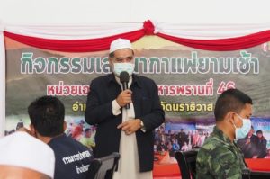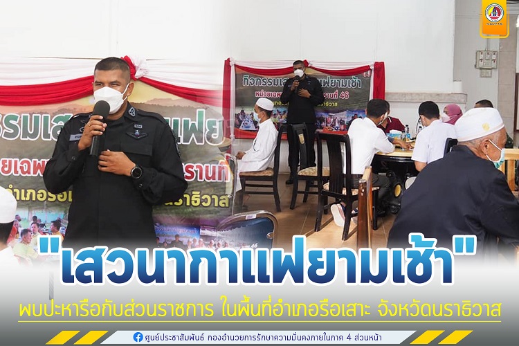 ที่ กองบังคับการหน่วยเฉพาะกิจกรมทหารพรานที่ 46 วัดสวนธรรม ตำบลรือเสาะออก อำเภอรือเสาะ จังหวัดนราธิวาส นายวิชาญ ชัยเศรษฐสัมพันธ์ นายอำเภอรือเสาะ เป็นประธานในกิจกรรม “เสวนากาแฟยามเช้า” โดยหน่วยเฉพาะกิจกรมทหารพรานที่ 46 จัดขึ้นเพื่อพบปะพูดคุยหารือข้อราชการ กระชับความสัมพันธ์อันดีระหว่างกัน และแลกเปลี่ยนข้อมูลข่าวสารในการขับเคลื่อนภารกิจ โดยมีพันเอก ทรงเดช สุกนุ้ย ผู้บังคับหน่วยเฉพาะกิจกรมทหารพรานที่ 46, พันตำรวจเอก ชาตรี รัตนคช ผู้กำกับการสถานีตำรวจภูธรรือเสาะ, นายซัมซุดดิน ฮามะ ผู้อำนวยการโรงพยาบาลรือเสาะ ผู้นำศาสนา ผู้นำท้องที่ ผู้นำท้องถิ่น และหัวหน้าส่วนราชการในพื้นที่ เข้าร่วมกิจกรรม ภายใต้มาตรการป้องกันและควบคุมการแพร่ระบาดของโรคโควิด-19 ตามที่กระทรวงสาธารณสุขกำหนดอย่างเคร่งครัด