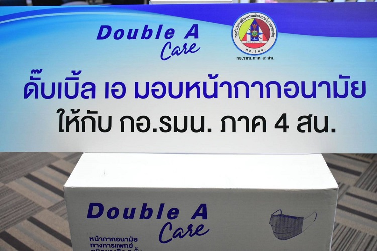 เมื่อวันที่ 12 พฤศจิกายน 2564 เวลา 13.30 น. นายชาญวิทย์ จารุสมบัติ รองกรรมการผู้จัดการใหญ่ ดั๊บเบิ้ล เอ ในนามของบริษัท ดั๊บเบิ้ล เอ (1991) จำกัด (มหาชน) ได้มอบผลิตภัณฑ์หน้ากากอนามัย Double A Care จำนวน 50,000 ชิ้น (50 ลัง) คิดเป็นมูลค่า 125,000 บาท ให้กับ กองอำนวยการรักษาความมั่นคงภายในภาค 4 ส่วนหน้า ณ ห้องรับรอง อาคารรับรองผู้โดยสาร ท่าอากาศยานทหาร 2 บน.6 เขตดอนเมือง กรุงเทพ โดยมี พลตรี วิทย์พล มักการุณ ประจำสำนักงานแม่ทัพภาคที่ 4 เป็นผู้แทน ผู้อำนวยการรักษาความมั่นคงภายในภาค 4 รับมอบหน้ากากอนามัย และจะจัดส่งโดยเครื่องบินลำเลียง ทอ. C-130 มายังท่าอากาศยานปัตตานี ใน 20 พฤศจิกายน 2564 ซึ่งสำนักมวลชนและกิจการพิเศษ กองอำนวยการรักษาความมั่นคงภายในภาค 4 ส่วนหน้า จะดำเนินการแจกจ่ายให้กับหน่วยขึ้นตรงต่อไป