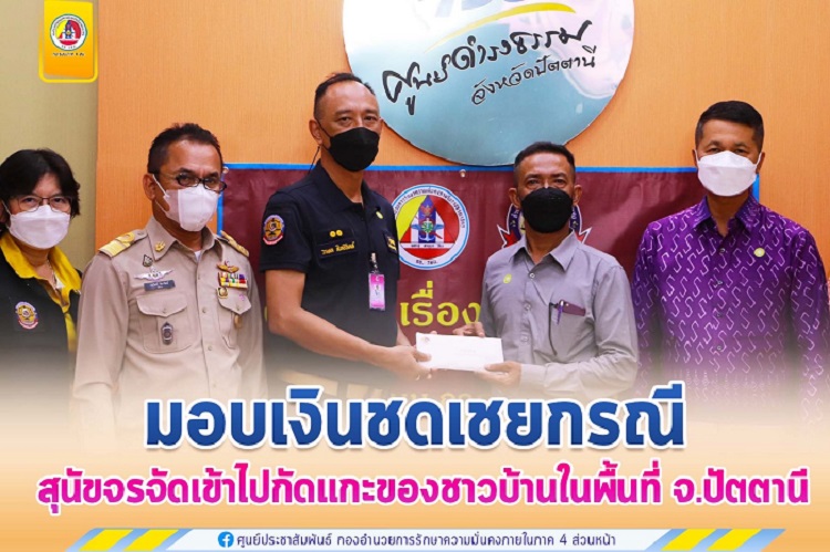 วันนี้ (16 พฤศจิกายน 2564) เวลา 13.30 น. ที่ ศูนย์ดำรงธรรมจังหวัดปัตตานี ศาลากลางจังหวัดปัตตานี อำเมือง จังหวัดปัตตานี พลเรือตรี วรพล สิทธิจิตต์ ผู้อำนวยการสำนักกฎหมายและสิทธิมนุษยชน กองอำนวยการรักษาความมั่นคงภายในภาค 4 ส่วนหน้า เป็นผู้แทน พลโท เกรียงไกร ศรีรักษ์ แม่ทัพภาคที่ 4 / ผู้อำนวยการรักษาความมั่นคงภายในภาค 4 มอบเงินชดเชยจำนวน 120,000 บาท ให้แก่ นายแวกอเดร์ แวโน๊ะ อยู่บ้านเลขที่ 71 ถนนสะบารัง ตำบลสะบารัง อำเภอเมือง จังหวัดปัตตานี ผู้ร้องกรณีมีเจ้าหน้าที่ทหารมาตั้งฐานปฏิบัติการประจำอยู่ในวัดหลักเมืองปัตตานี และได้สร้างสะพานข้ามคลองจากฐานปฏิบัติการข้ามมายังที่ดินของตนเองที่เลี้ยงแกะไว้ เป็นสาเหตุให้สุนัขจรจัดเดินข้ามสะพานมากัดแกะในที่ดินของตนเองที่ไม่ได้ล้อมรั้วตายจำนวน 31 ตัว เหตุเกิดเมื่อปี 2558 โดยมี ผู้แทนจากศูนย์ดำรงธรรม จังหวัดปัตตานี, ศูนย์อำนวยการบริหารจังหวัดชายแดนภาคใต้, ฝ่ายทหาร และภาคส่วนที่เกี่ยวข้อง ร่วมเป็นสักขีพยาน