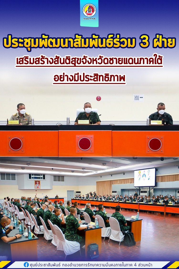 พลโท เกรียงไกร ศรีรักษ์ แม่ทัพภาคทึ่ 4 / ผู้อำนวยการรักษาความมั่นคงภายในภาค 4 กล่าวว่า วันนี้ เป็นโอกาสดี ที่ได้มีการประชุมพัฒนาสัมพันธ์ร่วมกัน 3 ฝ่าย ทั้ง ทหาร ตำรวจ และ ศอ.บต. เพื่อขับเคลื่อนงานร่วมกัน ทั้งงานด้านความมั่นคง และงานด้านการพัฒนาในพื้นที่ เป็นสิ่งที่สำคัญมาก เพราะเราคือ กำลังหลัก ที่จะร่วมกันแก้ไขปัญหาความไม่สงบในพื้นที่ และประการสำคัญ ที่จะนำไปสู่ความยั่งยืนได้ คืองานการพัฒนา การหาโอกาสดีๆ ที่จะได้มาประชุม พบปะพัฒนาสัมพันธ์กันในลักษณะนี้ เป็นสิ่งที่ได้คิดอยู่เสมอ ที่จะดำเนินการร่วมกัน ความใกล้ชิด ความเป็นพี่เป็นน้อง ของผู้ที่ปฏิบัติงานในพื้นที่ เป็นสิ่งสำคัญ จะทำให้การขับเคลื่อนงานในพื้นที่ จะเป็นไปได้ อย่างมีประสิทธิภาพ สำหรับข้อเน้นย้ำในการประชุมครั้งนี้ ในด้านการติดตามภาพข่าวและการแจ้งเตือน ต้องให้ถึงกำลังพลแนวหน้าโดยเฉพาะเจ้าหน้าที่ที่ปฏิบัติงานจุดตรวจต่างๆ ให้ได้รับรู้รับทราบด้วย ส่วนในด้านการกดดัน หมู่บ้าน Support Site เพื่อทำลายการวางแผนของฝ่ายตรงข้าม โดยเป็นหน้าที่ของชุดปฏิบัติการพิทักษ์พื้นที่ เพื่อดูแลความปลอดภัยชีวิตและทรัพย์สินของพี่น้องประชาชน ระมัดระวังการถูกลวงเข้าพื้นที่ ด้วยเหตุการณ์เล็กๆ การเข้าคลี่คลายสถานการณ์ต้องมีเทคนิค พิจารณาให้ถ่องแท้ และวางแผนอย่างเป็นขั้นตอน ผู้ก่อเหตุรุนแรงมีการวางแผนเป็นขั้นตอน ทั้งการเกาะติด การก่อเหตุ มีการเตรียมพื้นที่ มีการหลบหนี มีการฝากอาวุธปืน เพ่งเล็ง ยานพาหนะของทหาร ตำรวจ การประสานงานของหน่วยทหาร ตำรวจ ในการเข้าทำงานในพื้นที่ให้มีความแน่นแฟ้น ทำงานเป็นเนื้อเดียวกัน ทำพื้นที่ให้ปลอดภัย ช่วยเหลือกันได้ การระมัดระวังฐานปฏิบัติการ ฐานชุดคุ้มครองตำบล จัดระบบให้ มีการคุ้มกัน การติดตั้งกล้องวงจรปิด มีการเข้าเวรยาม ยามพร้อมยิง ระวังการถูกขว้างระเบิดไปบ์บอมบ์ การใช้สื่อโซเชียลอย่างถูกต้องเหมาะสม ไม่ให้กระทบตนเองและองค์กร ใช้สื่อโซเชียลอย่างระมัดระวังมากยิ่งขึ้น การดูแลสวัสดิการ และสิทธิกำลังพล ต้องดูแลลูกน้อง อย่างทั่วถึง ไม่เบียดบัง สิทธิของลูกน้อง อาวุธ กระสุน ดูแลให้ดี อย่าให้รั่วไหล การสูญเสียทางธุรการ ทุกกรณี ทั้งโรคซึมเศร้าหรือโรคทางประสาท ให้หมั่นตรวจสอบกำลังพล สุดท้ายนี้ ขอขอบคุณ ทุกหน่วย ที่ได้ชี้แจงข้อมูลที่มีความสำคัญ โดยเฉพาะ ศูนย์อำนวยการบริหารจังหวัดชายแดนภาคใต้ (ศอ.บต.) ได้ชี้แจงแผนการปฏิบัติงานในปี 2565 ให้หน่วยงานทหาร ตำรวจ รับทราบข้อมูล ทำให้เกิดการรับรู้ และความเข้าใจร่วมกัน
