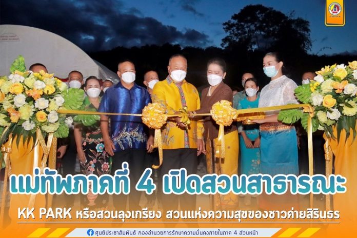 วันที่ 19 พฤศจิกายน 2564 เวลา 17.30 น. ณ สวนสาธารณะ KK PARK ค่ายสิรินธร ตำบลเขาตูม อำเภอยะรัง จังหวัดปัตตานี พลโท เกรียงไกร ศรีรักษ์ แม่ทัพภาคที่ 4/ ผู้อำนวยการรักษาความมั่นคงภายในภาค 4 เป็นประธานเปิดสวนสาธารณะ KK PARK ซึ่งกองอำนวยการรักษาความมั่นคงภายในภาค 4 ส่วนหน้า ได้สนับสนุนงบประมาณในการก่อสร้างให้กับหน่วย โดยใช้พื้นที่ว่างภายในค่ายสิรินธร เพื่อเป็นแหล่งนันทนาการ สถานที่พักผ่อนหย่อนใจของกำลังพล ครอบครัว ตลอดจนกำลังพลที่มาช่วยราชการ โดยมีคุณคนึงนิตย์ ศรีรักษ์ ประธานสมาคมแม่บ้านทหารบก สาขากองทัพภาคที่ 4 คณะผู้บังคับบัญชา กำลังพล และครอบครัวที่อาศัยอยู่ภายในค่ายสิรินธรร่วมพิธีในครั้งนี้