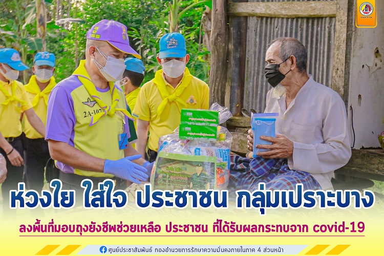 ทั้งนี้เนื่องจากสถานการณ์การแพร่ระบาดของเชื้อไวรัส covid-19 ในจังหวัดชายแดนภาคใต้ที่ยังคงระบาดอย่างต่อเนื่อง ทำให้ประชาชนได้รับความเดือดร้อน กระทบต่อการออกไปประกอบอาชีพเพื่อเลี้ยงดูครอบครัวได้ โดย พลตรี อุทิศ อนันตนานนท์ รองผู้อำนวยการรักษาความมั่นคงภายในภาค 4 และคณะฯ มีความห่วงใยประชาชนที่ได้รับความเดือดร้อนจากสถานการณ์ดังกล่าว จึงได้เดินทางไปมอบถุงยังชีพ เครื่องบริโภคที่จำเป็น พร้อมหน้ากากอนามัย และเจลล้างมือ โดยในครั้งนี้ได้มอบให้ทั้งสิ้น จำนวน 7 ครัวเรือน เพื่อบรรเทาความเดือดร้อนให้ประชาชนในขั้นต้น พร้อมทั้งรณรงค์ขอความร่วมมือประชาชนให้สวมใส่หน้ากากอนามัย เว้นระยะห่าง มั่นล้างมือด้วยสบู่หรือเจลแอลกอฮอล์ ทานอาหารที่ปรุงสุก และสร้างภูมิคุ้มกันหมู่ด้วยการฉีดวัคซีน ตามมาตรการของศูนย์บูรณาการแก้ไขสถานการณ์ covid-19 ส่วนหน้า และขอเป็นกำลังใจให้พี่น้องประชาชน ต่อสู้เพื่อก้าวผ่านวิกฤตนี้ไปพร้อมกัน