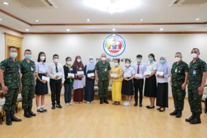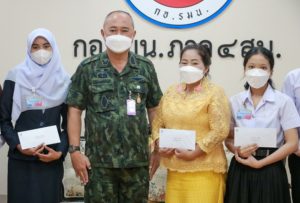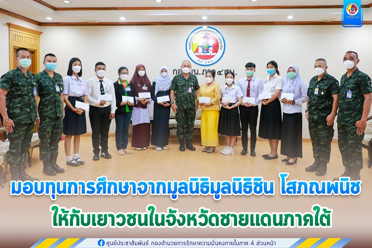 วันนี้ (24 พฤศจิกายน 2564) เวลา 10.00 น. ที่ห้องรับรอง กองอำนวยการรักษาความมั่นคงภายในภาค 4 ส่วนหน้า ค่ายสิรินธร อำเภอยะรัง จังหวัดปัตตานี พลตรี วัฒนา กรมขันธ์ เลขาธิการกองอำนวยการรักษาความมั่นคงภายในภาค 4 ส่วนหน้า เป็นประธานในพิธีมอบทุนการศึกษาให้กับนักเรียนนักศึกษาในจังหวัดชายแดนภาคใต้ จากมูลนิธิมูลนิธิชิน โสภณพนิช จำนวน 10 ทุน ระดับมัธยมศึกษาจำนวน 3 ทุนๆ ละ 10,000 บาท แลระดับอุดมศึกษา จำนวน 7 ทุนๆ ละ 15,000 บาท เพื่อเป็นการส่งเสริมและสนับสนุนการศึกษาให้กับเด็กในพื้นที่จังหวัดชายแดนภาคใต้อย่างต่อเนื่องจนจบปริญญาตรี ซึ่งปัจจุบันเยาวชนในพื้นที่ใช้ทุนการศึกษาในหลากหลายสาขาอาชีพ และเมื่อสำเร็จการศึกษาแล้ว ก็พร้อมจะกลับมาพัฒนาชุมชนบ้านเกิดของตัวเอง โดยในพิธีดังกล่าวมี คณะผู้บังคับบัญชาจากกองอำนวยการรักษาความมั่นคงภายในภาค 4 ส่วนหน้า เข้าร่วม