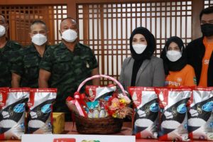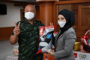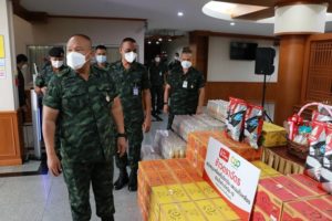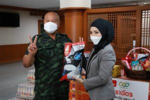 วันนี้ (26 พฤศจิกายน 2564) เวลา 10.00 น. ณ ห้องโถง กองอำนวยการรักษาความมั่นคงภายในภาค 4 ส่วนหน้า ค่ายสิรินธร ตำบลเขาตูม อำเภอยะรัง จังหวัดปัตตานี พลโท เกรียงไกร ศรีรักษ์ แม่ทัพภาคที่ 4 / ผู้อำนวยการรักษาความมั่นคงภายในภาค 4 รับมอบผลิตภัณฑ์เครื่องดื่มและข้าวสารตราฉัตรในเครือ บริษัท ซี.พี. อินเตอร์เทรด จำกัด (ข้าวตราฉัตร) นำโดย คุณมีนา หวังจิ รองกรรมการผู้จัดการอาวุโส บริษัท ซี.พี. อินเตอร์เทรด จำกัด (ข้าวตราฉัตร) เพื่อนำไปส่งมอบต่อให้กับเจ้าหน้าที่ที่ปฏิบัติหน้าที่ในพื้นที่จังหวัดชายแดนภาคใต้และประชาชนที่ได้รับความเดือดร้อนจากสถานการณ์การแพร่ระบาดของเชื้อไวรัสโควิด-19 ในพื้นที่ ประกอบด้วย เครื่องดื่มนมถั่วเหลืองตราฉัตร จำนวน 7,200 ขวด เครื่องดื่มวิตามินซี จำนวน 3,000 ขวด และข้าวหอมมะลิใหม่ตราฉัตร จำนวน 30 กิโลกรัม