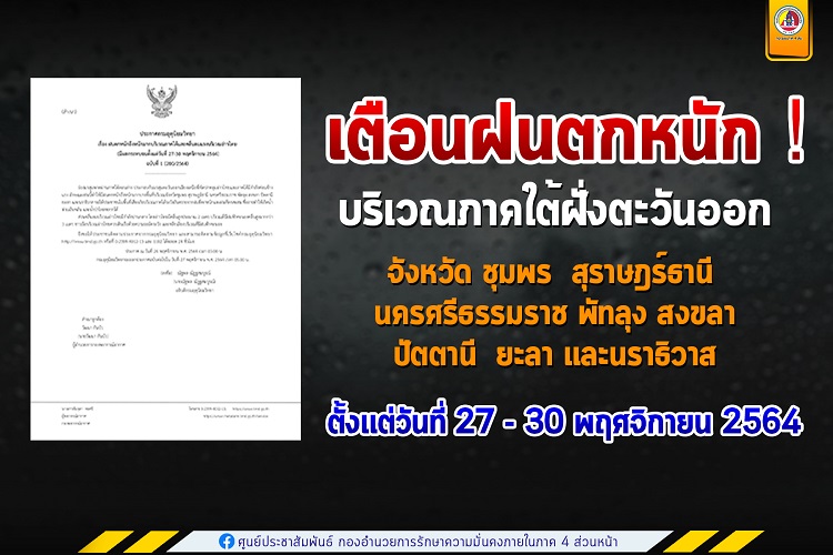 วันนี้ 26 พ.ย.64 กรมอุตุนิยมวิทยา ประกาศแจ้งเตือนประชาชน เนื่องจากฝนตกหนักมากบริเวณภาคใต้และคลื่นลมแรงบริเวณอ่าวไทย และภาคใต้มีกำลังค่อนข้างแรง ลักษณะเช่นนี้ อาจทำให้มีฝนตกหนักมากบางพื้นที่ บริเวณจังหวัดชุมพร สุราษฎร์ธานี นครศรีธรรมราช พัทลุง สงขลา ปัตตานี ยะลา และนราธิวาส