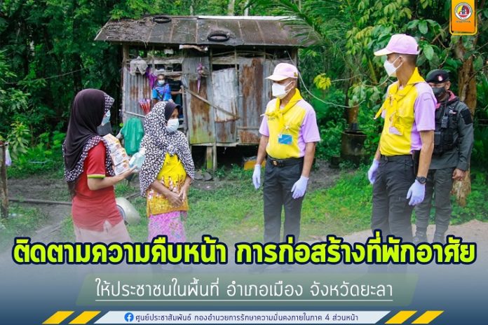 พลตรี อุทิศ อนันตนานนท์ รองผู้อำนวยการรักษาความมั่นคงภายในภาค 4 ส่วนหน้า / หัวหน้าจิตอาสา 904 ภาค 4 ลงพื้นที่ ตำบลพร่อน อำเภอเมือง จังหวัดยะลา เพื่อติดตามความคืบหน้า ในการก่อสร้างที่พักอาศัยให้กับครอบครัวของ นางสาวอายิยะ บาเหม อายุ 60 ปี ซึ่งเป็นผู้ที่มีรายได้น้อย และได้รับผลกระทบจากสถานการณ์การแพร่ระบาดของเชื้อไวรัส covid-19 ประกอบกับมีที่พักอาศัยที่ชำรุดทรุดโทรมอย่างมาก จึงได้รับคัดเลือกให้ได้รับการช่วยเหลือตามโครงการ”จิตอาสา 904 จังหวัดยะลา ห่วงใย ให้บ้าน” ซึ่งเป็นหลังที่แรกของโครงการฯ โดยมีคณะจิตอาสา 904 จังหวัดยะลา, ผู้นำท้องถิ่น และเจ้าหน้าที่ตำรวจที่รับผิดชอบพื้นที่ ร่วมติดตามความคืบหน้าในการก่อสร้างที่พักอาศัยดังกล่าว