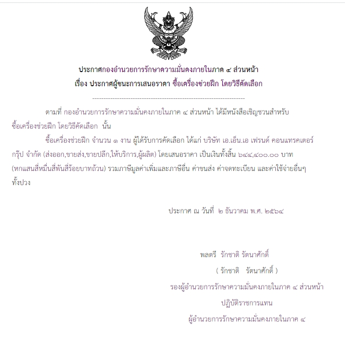 ประกาศผู้ชนะการเสนอราคา ซื้อเครื่องช่วยฝึก โดยวิธีคัดเลือก