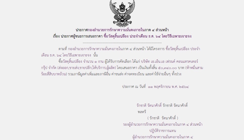 ประกาศผู้ชนะการเสนอราคา ซื้อวัสดุสิ้นเปลือง ประจำเดือน ธ.ค. 64 โดยวิธีเฉพาะเจาะจง