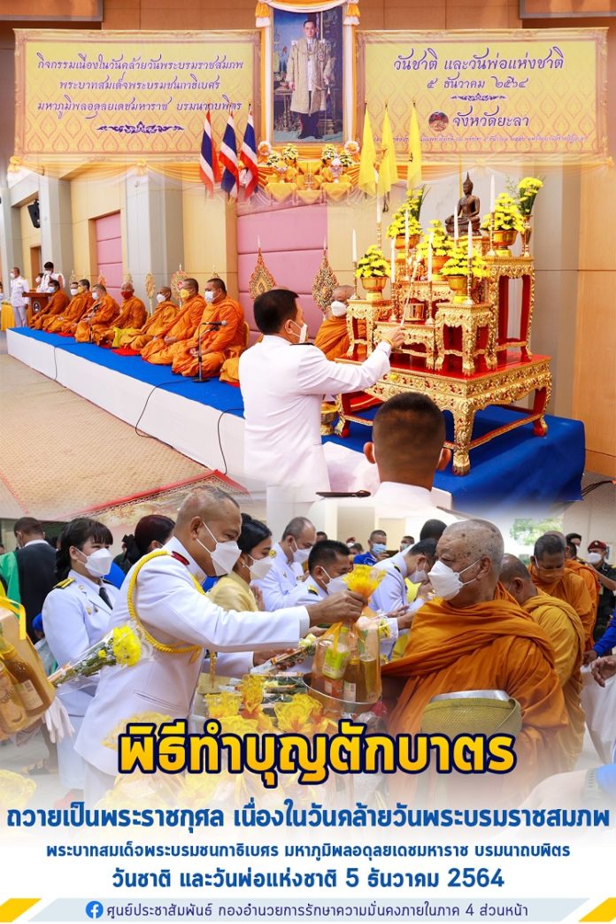 วันนี้ (5 ธันวาคม 2564) เวลา 07.30 น. ที่ห้องประชุมเฉลิมพระเกียรติ 50 พรรษา 5 ธันวาคม 2550 มหาวิทยาลัยราชภัฏยะลา อำเภอเมือง จังหวัดยะลา นายภิรมย์ นิลทยา ผู้ว่าราชการจังหวัดยะลา เป็นประธานในพิธี พร้อมด้วย พลตรี อุทิศ อนันต์นานนท์ รองแม่ทัพภาคที่ 4 / รองผู้อำนวยการรักษาความมั่นคงภายในภาค 4 ส่วนหน้า ข้าราชการ ทหาร ตำรวจ หน่วยงานภาครัฐ ภาคเอกชน เหล่ากาชาดจังหวัดยะลา และพสกนิกรชาวจังหวัดยะลาทุกหมู่เหล่า ร่วมประกอบพิธีทำบุญตักบาตร ถวายเป็นพระราชกุศล เนื่องในวันคล้ายวันพระบรมราชสมภพ พระบาทสมเด็จพระบรมชนกาธิเบศร มหาภูมิพลอดุลยเดชมหาราช บรมนาถบพิตร วันชาติ และวันพ่อแห่งชาติ 5 ธันวาคม 2564 เพื่อน้อมรำลึกในพระมหากรุณาธิคุณของพระบาทสมเด็จพระบรมชนกาธิเบศ มหาภูมิพลอดุลยเดชมหาราช บรมนาถบพิตร