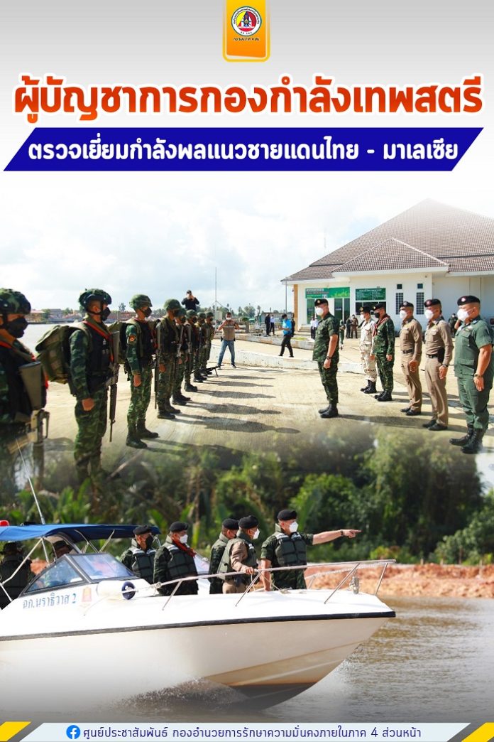 จากนั้น ผู้บัญชาการกองกำลังเทพสตรี เดินทางไปตรวจเยี่ยมกำลังพลที่ปฏิบัติงานในพื้นที่รับผิดชอบ ของ กองกำลังเทพสตรี ด้านชายแดนไทย – มาเลเซีย บริเวณ อำเภอตากใบ จังหวัดนราธิวาส ซึ่งประกอบด้วย การลาดตระเวนทางน้ำ บริเวณแนวแม่น้ำสุไหงโก – ลก อำเภอตากใบ จังหวัดนราธิวาส และตรวจเยี่ยมชุดปฏิบัติการพิทักษ์พื้นที่ บริเวณด่านศุลกากรตากใบ อำเภอตากใบ จังหวัดนราธิวาส โดยเน้นย้ำข้อสั่งการตามนโยบายผู้บังคับบัญชา และมอบแนวทางในการปฏิบัติงาน พร้อมทั้งมอบสิ่งของบำรุงขวัญ เพื่อเป็นขวัญกำลังใจให้กับกำลังพลที่ปฏิบัติงานในพื้นที่ตามแนวชายแดนไทย – มาเลเซีย