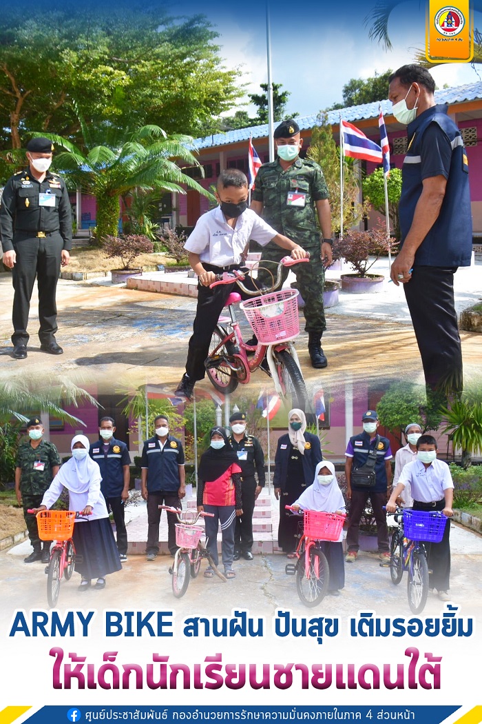 สำหรับโครงการ “จักรยานสานฝัน ปันสุข กองทัพบก” เป็นโครงการของกองทัพบก ที่มีนโยบายเพื่อให้นักเรียนได้มีรถจักรยานใช้ในการเดินทางมาเรียนหนังสือ โดยการขอรับบริจาครถจักรยานที่ไม่ได้ใช้ นำกลับมาซ่อมแซมให้สามารถใช้การได้ตามปกติ เพื่อมอบให้กับน้องๆ นักเรียนที่มีความจำเป็นที่จะต้องใช้ในการเดินทางมาโรงเรียน สร้างฝัน เติมร้อยยิ้มให้กับนักเรียนในพื้นที่ชายแดนใต้