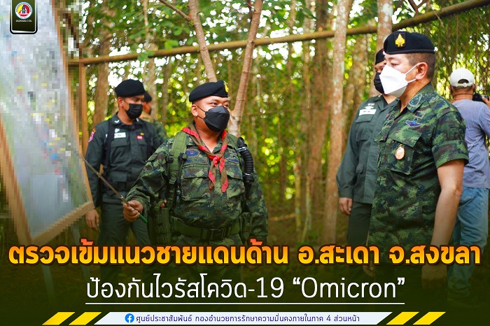 พลตรี ศานติ ศกุนตนาค รองแม่ทัพภาคที่ 4 / รองผู้บัญชาการศูนย์ปฏิบัติการกองทัพภาคที่ 4 และคณะ ตรวจเยี่ยมการปฏิบัติตามแนวชายแดน พื้นที่อำเภอสะเดา จังหวัดสงขลา เพื่อติดตามการสกัดกั้นป้องกันการแพร่ระบาดของเชื้อไวรัสโควิด – 19 “Omicron” ตามแนวชายแดนไทย – มาเลเซีย และมาตรการรองรับการเปิดประเทศ (Covid Free Setting) โดยมี พลตรี วรเดช เดชรักษา ผู้บัญชาการกองพลทหารราบที่ 5, พันเอก ฐนิตพนธ์ หงษ์วิไล ผู้บังหน่วยเฉพาะกิจกรมทหารราบที่ 5 พร้อมด้วยหัวหน้าส่วนราชการในพื้นที่ ให้การต้อนรับ
