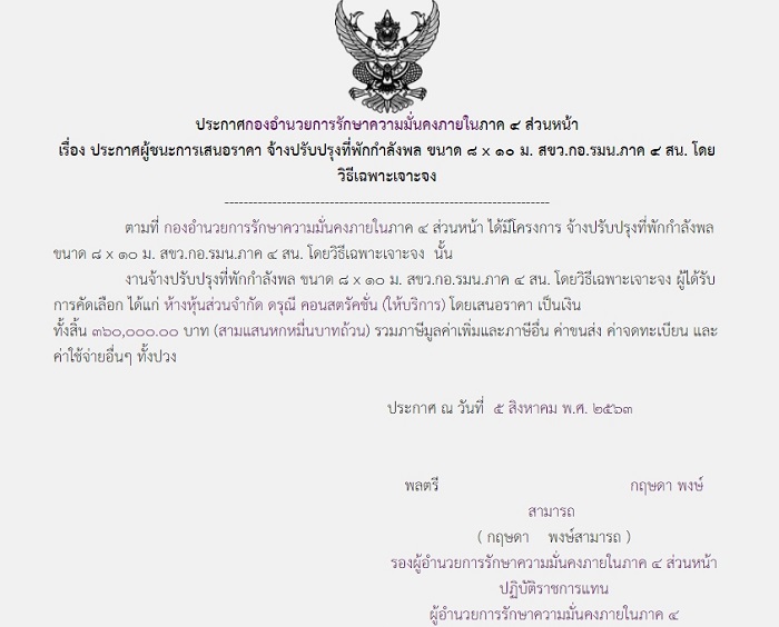 ประกาศผู้ชนะการเสนอราคา จ้างปรับปรุงที่พักกำลังพล ขนาด 8 x 10 ม. สขว.กอ.รมน.ภาค 4 สน. โดยวิธีเฉพาะเจาะจง (360,000.00)