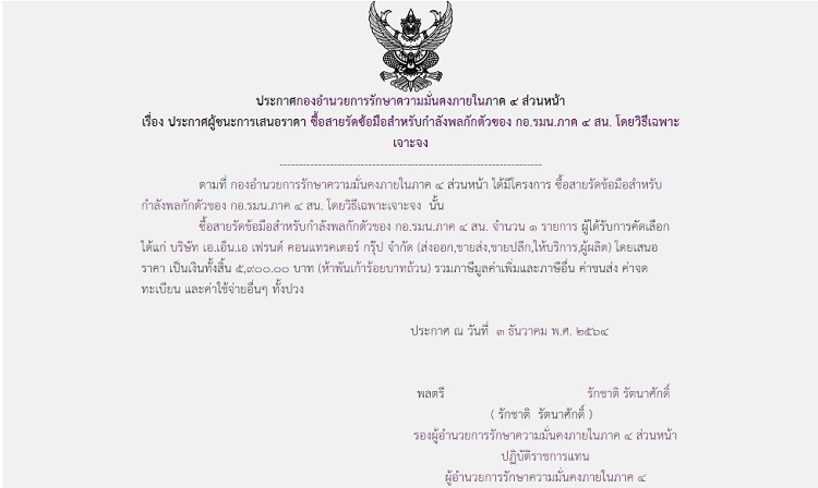 จัดซื้อ จัดจ้างประกาศผู้ชนะการเสนอราคา ประกาศผู้ชนะการเสนอราคา ซื้อสายรัดข้อมือสำหรับกำลังพลกักตัวของ กอ.รมน.ภาค 4 สน. โดยวิธีเฉพาะเจาะจง (5,900 บาท) December 13, 2021 528 Share Facebook Twitter Google+ Telegram LINE