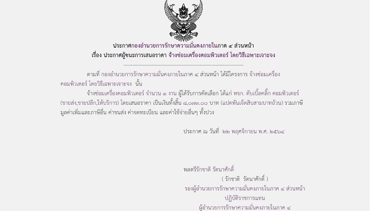 ประกาศผู้ชนะการเสนอราคา จ้างซ่อมเครื่องคอมพิวเตอร์ โดยวิธีเฉพาะเจาะจง (8,073 บาท)