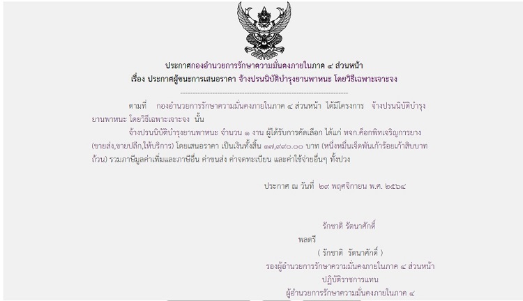 ประกาศผู้ชนะการเสนอราคา จ้างปรนนิบัติบำรุงยานพาหนะ โดยวิธีเฉพาะเจาะจง (17,990 บาท)