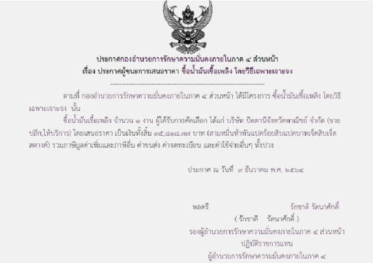 ประกาศผู้ชนะการเสนอราคา ซื้อน้ำมันเชื้อเพลิง โดยวิธีเฉพาะเจาะจง (35,818.77 บาท)