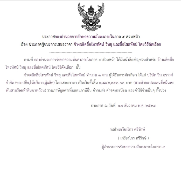จัดซื้อ จัดจ้างประกาศผู้ชนะการเสนอราคา ประกาศผู้ชนะการเสนอราคา จ้างผลิตสื่อโทรทัศน์ วิทยุ และสื่อโสตทัศน์ โดยวิธีคัดเลือก (3,846,350 บาท) December 17, 2021 539 Share Facebook Twitter Google+ Telegram LINE