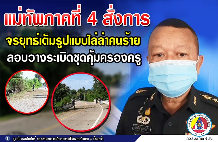 ทั้งนี้ แม่ทัพภาคที่ 4 ยังได้แสดงความเสียใจต่อครอบครัวผู้บาดเจ็บและเสียชีวิต พร้อมทั้งได้สั่งการให้หน่วยดูแลด้านสิทธิกำลังพลอย่างเต็มที่และเร่งด่วน และขอให้ความร่วมมือพี่น้องประชาชนหากพบเห็นบุคคลที่ต้องสงสัยเข้ามาเคลื่อนไหวในพื้นที่ ให้แจ้งมายังเจ้าหน้าที่ หรือแจ้งไปยังหมายเลขโทรศัพท์สายตรงแม่ทัพภาคที่ 4 โทร : 061-1732999 ได้ตลอด 24 ชั่วโมง