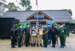 จากนั้น รองผู้อำนวยการรักษาความมั่นคงภายในภาค 4 ส่วนหน้า และคณะ เดินทางไปติดตามความคืบหน้าในการสร้างที่พักอาศัย และมอบเครื่องบริโภคเพื่อบรรเทาความเดือดร้อนในขั้นต้น ให้กับครอบครัวของ นางแมะเลาะ รอแมะ ในพื้นที่ ตำบลโต๊ะเด็ง อำเภอสุไหงปาดี จังหวัดนราธิวาส ซึ่งครอบครัวดังกล่าว มีรายได้น้อย มีที่อยู่อาศัยที่ชำรุดทรุดโทรม และได้รับผลกระทบจากสถานการณ์การแพร่ระบาดของเชื้อไวรัสโควิด-19 โดยได้รับคัดเลือก ให้รับความช่วยเหลือในโครงการ “ให้บ้านให้ความสุข” เพื่อยกระดับความเป็นอยู่ของประชาชนให้มีที่อยู่อาศัยที่มั่นคงแข็งแรง ทั้งนี้การก่อสร้างบ้านหลังดังกล่าวมีความคืบหน้าไปแล้วกว่า 40%