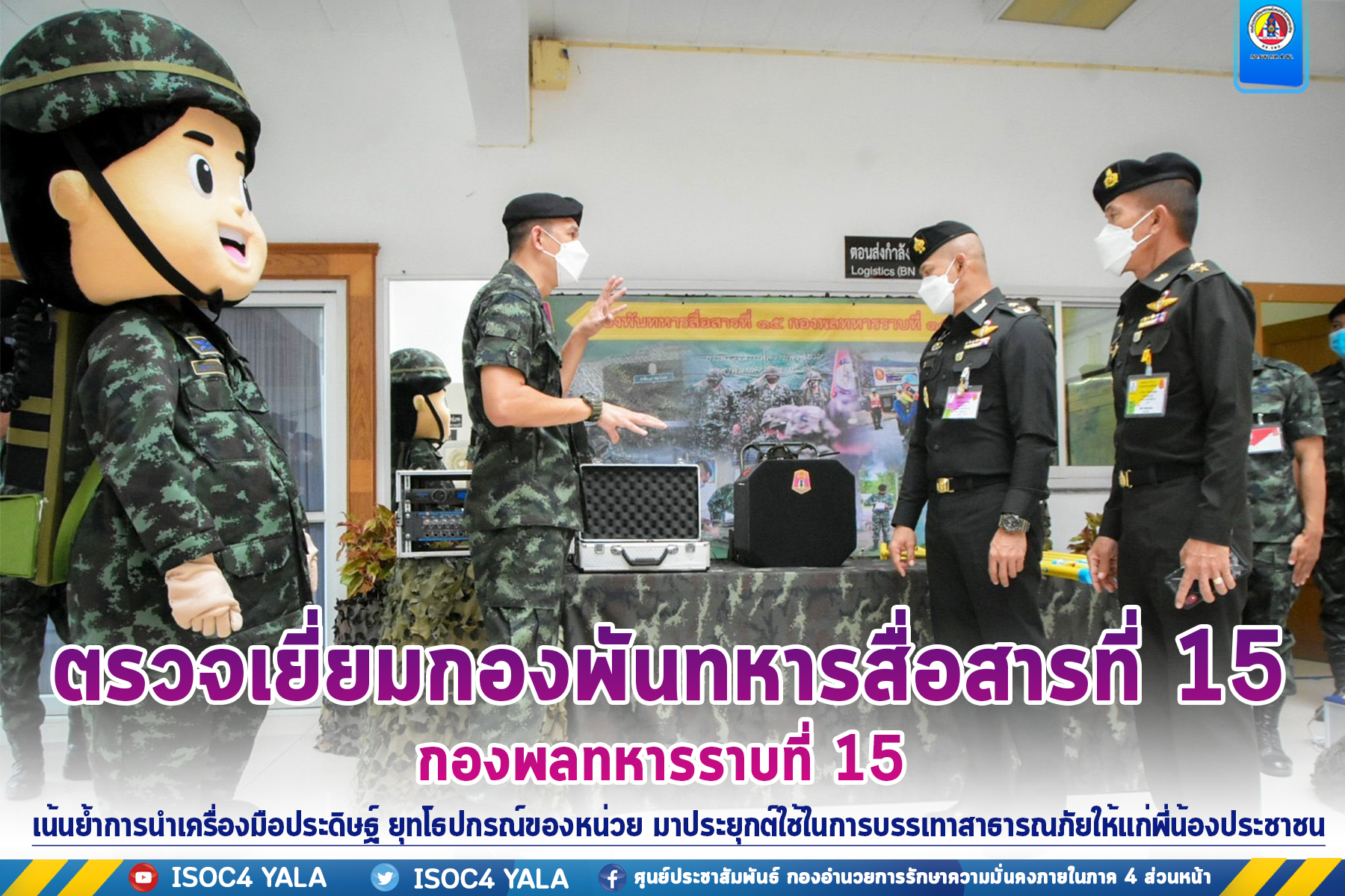 เมื่อวันที่ 21 ธันวาคม 2564 เวลา 15.00 น. ที่กองพันทหารสื่อสารที่ 15 กองพลทหารราบที่ 15 ค่ายสมเด็จพระสุริโยทัย ตำบลบ่อทอง อำเภอหนองจิก จังหวัดปัตตานี พลตรีเฉลิมพร ขำเขียว ผู้บัญชาการกองพลทหารราบที่ 15 พร้อมด้วย พันเอก พิเชษฐ์ ชุติเดโช เสนาธิการกองพลทหารราบที่ 15 และคณะเดินทางตรวจเยี่ยมกองพันทหารสื่อสารที่ 15 กองพลทหารราบที่ 15 รับฟังบรรยายสรุปการปฏิบัติงานที่สำคัญในห้วงที่ผ่านมา และแผนการปฏิบัติงานในห้วงต่อไป และรับชมการจัดแสดงสาธิต เครื่องมือประดิษฐ์ ยุทโธปกรณ์ของหน่วย โดยพลตรีเฉลิมพร ขำเขียว ผู้บัญชาการกองพลทหารราบที่ 15 ได้มอบแนวทางการปฏิบัติงานให้แก่กำลังพล เพื่อนำไปยืดถือ และปฏิบัติตามนโยบาย และเน้นย้ำเกี่ยวกับมาตรการป้องกันการแพร่ระบาดของเชื้อไวรัสโคโรนา (COVID – 19) รวมถึงเน้นย้ำให้กำลังพลดูแลสุขภาพให้แข็งแรง ถึงแม้สภาพอากาศไม่เอื้ออำนวย และอยู่ในช่วงฤดูฝน ก็ไม่มีผลกระทบต่อการปฏิบัติงานแต่อย่างใด เจ้าหน้าที่ต้องมีความพร้อมทุกสถานการณ์ และขอให้กําลังพลทุกนาย มีความตั้งใจในการปฏิบัติหน้าที่ตามที่ได้รับมอบหมายอย่างเต็มความสามารถ