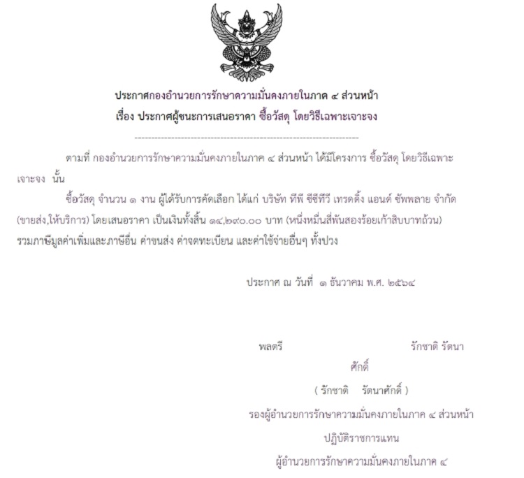 ประกาศผู้ชนะการเสนอราคา ซื้อวัสดุ โดยวิธีเฉพาะเจาะจง (14,290 บาท)