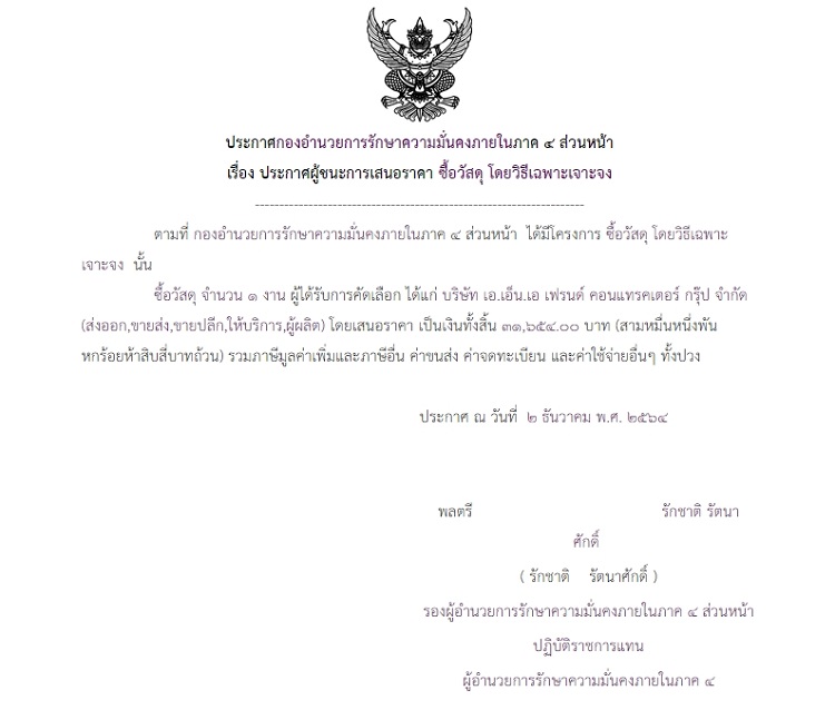 ประกาศผู้ชนะการเสนอราคา ซื้อวัสดุ โดยวิธีเฉพาะเจาะจง (31,654 บาท)