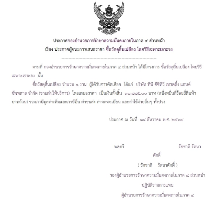ประกาศผู้ชนะการเสนอราคา ซื้อวัสดุสิ้นเปลือง โดยวิธีเฉพาะเจาะจง (10,445 บาท)