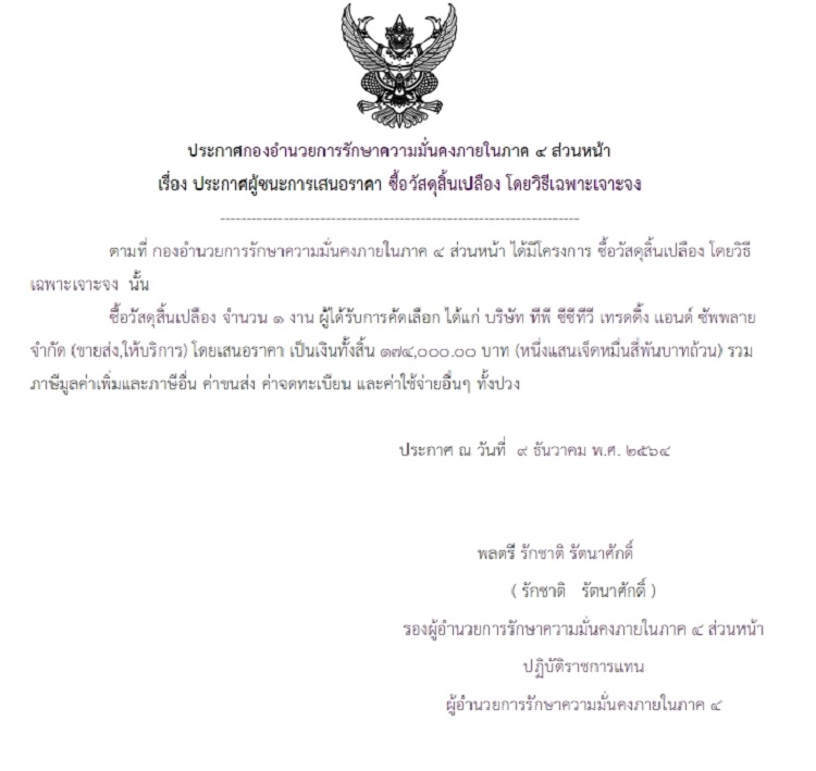 ประกาศผู้ชนะการเสนอราคา ซื้อวัสดุสิ้นเปลือง โดยวิธีเฉพาะเจาะจง (174,000 บาท)