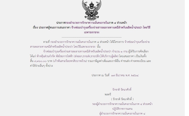 จัดซื้อ จัดจ้างประกาศผู้ชนะการเสนอราคา ประกาศผู้ชนะการเสนอราคา จ้างซ่อมบำรุงเครื่องจ่ายสารละลายทางเคมีสำหรับผลิตน้ำประปา โดยวิธีเฉพาะเจาะจง (9,360 บาท) December 23, 2021 527 Share Facebook Twitter Google+ Telegram LINE