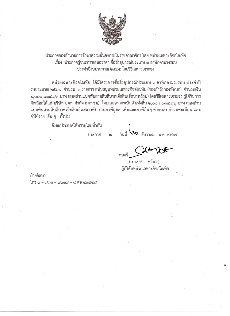 จัดซื้อ จัดจ้างประกาศผู้ชนะการเสนอราคา ประกาศผู้ชนะการเสนอราคา ซื้อสิ่งอุปกรณ์ประเภท 3 ลาพักตามวงรอบ ประจำปีงบประมาณ 2565 โดยวิธีเฉพาะเจาะจง (2,008,034.71 บาท) December 23, 2021 613 Share Facebook Twitter Google+ Telegram LINE