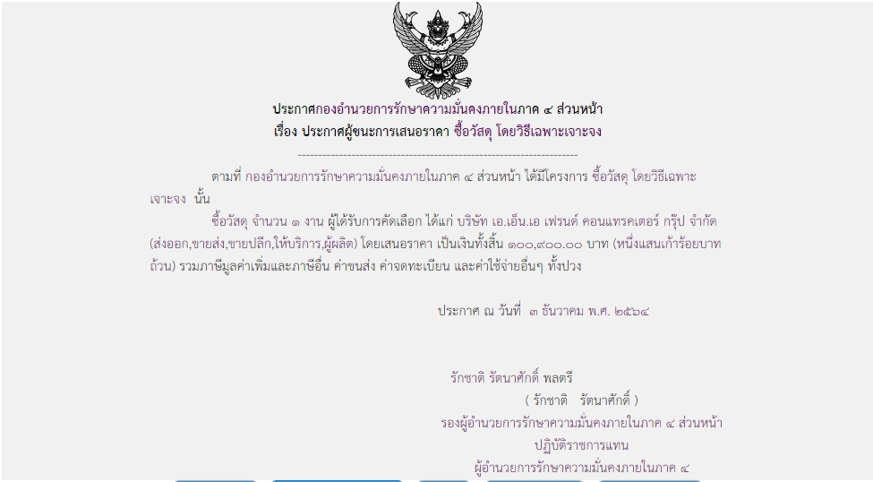 ประกาศผู้ชนะการเสนอราคา ซื้อวัสดุ โดยวิธีเฉพาะเจาะจง
