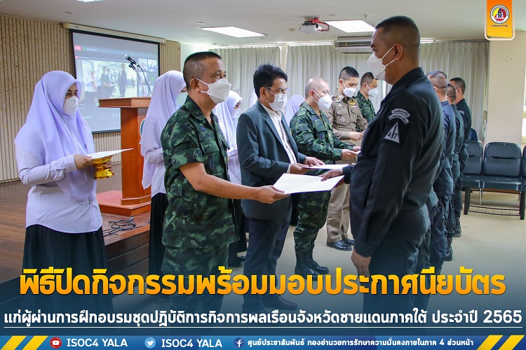 เมื่อวันที่ ( 24 ธ.ค. 64 ) เวลา 10.00 น. ที่ห้องประชุมเวิ่งช่าย ชั้น 3 อาคาร 20(อาคาร 50 พรรษา มหาวชิราลงกรณ) มหาวิทยาลัยราชภัฏยะลา พลตรีปราโมทย์ พรหมอินทร์ รองผู้อำนวยการรักษาความมั่นคงภายในภาค 4 ส่วนหน้า เป็นประธานพิธีปิดกิจกรรมพร้อมมอบประกาศนียบัตรแก่ผู้ผ่านการฝึกอบรมชุดปฏิบัติการกิจการพลเรือนจังหวัดชายแดนภาคใต้ ประจำปี 2565 ร่วมรับชมวีดิทัศน์และรับฟังการบรรยายสรุปจากตัวแทนชุดปฏิบัติการกิจการพลเรือนจังหวัดชายแดนภาคใต้ จำนวน 3 กลุ่ม โดยมี รองผู้บัญชาการโรงเรียนกิจการพลเรือน กรมกิจการพลเรือนทหารบก,ผู้อำนวยการกองการศึกษา โรงเรียนกิจการพลเรือน กรมกิจการพลเรือนทหารบก ,รองอธิการบดีมหาวิทยาลัยราชภัฏยะลา, ผู้แทนชมรมพัฒนาสัมพันธ์ระดับผู้บริหาร,ผู้บัญชาการหน่วยเฉพาะกิจตำรวจยะลา 91 ,หน่วยเฉพาะกิจยะลา ปัตตานี และนราธิวาส และผู้ผ่านการฝึกอบรมชุดปฏิบัติการกิจการพลเรือนจังหวัดชายแดนภาคใต้ ประจำปี 2565 เข้าร่วม