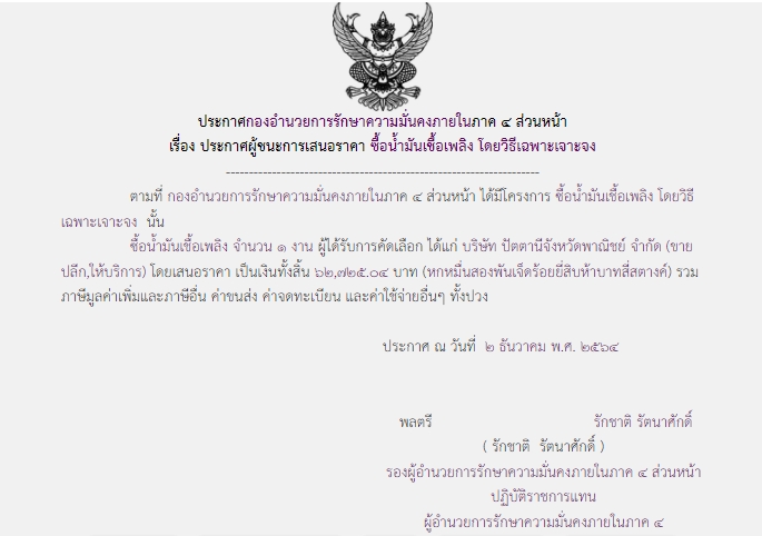 ประกาศผู้ชนะการเสนอราคา ซื้อน้ำมันเชื้อเพลิง โดยวิธีเฉพาะเจาะจง
