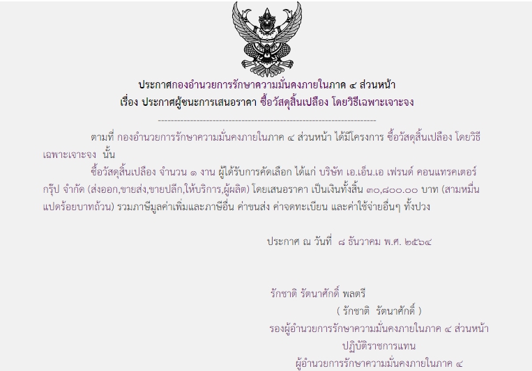 ประกาศผู้ชนะการเสนอราคา ซื้อวัสดุสิ้นเปลือง โดยวิธีเฉพาะเจาะจง