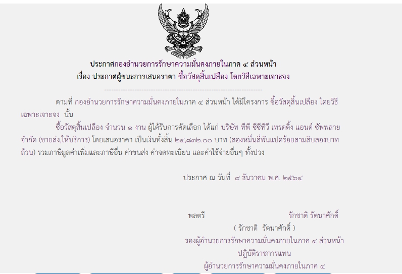 ประกาศผู้ชนะการเสนอราคา ซื้อวัสดุสิ้นเปลือง โดยวิธีเฉพาะเจาะจง