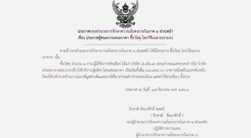 ประกาศผู้ชนะการเสนอราคา ซื้อวัสดุ โดยวิธีเฉพาะเจาะจง