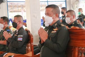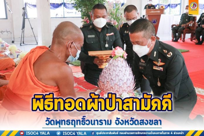 วันนี้ (25 ธันวาคม 2564) เวลา 13.00 น. ณ วัดพุทธฤทธิ์วนาราม (วัดบ้านไร่) หมู่ 5 ตำบลสะบ้าย้อย อำเภอสะบ้าย้อย จังหวัดสงขลา พลตรีปราโมทย์ พรหมอินทร์ รองผู้อำนวยการรักษาความมั่นคงภายในภาค 4 ส่วนหน้า / ผู้บัญชาการมณฑลทหารบกที่ 41 เป็นประธานฝ่ายฆราวาสในพิธีทอดผ้าป่าสามัคคี สมทบทุนสร้างเตาเผาศพปลอดมลพิษ ทั้งอนุรักษ์สืบสานประเพณีวัฒนธรรมอันดีงาม ทำนุบำรุง สืบสานวัฒนธรรมขนบธรรมเนียมประเพณีในพระพุทธศาสนาให้คงอยู่ ตลอดจนส่งเสริมความรักความสามัคคีของประชาชนในพื้นที่ โดยมี พระครูอรรถกิจไพศาล เจ้าคณะอำเภอสะบ้าย้อย เป็นประธานฝ่ายสงฆ์ พร้อมด้วย พระสมุห์อรรถ ปัญญาวโร เจ้าอาวาส วัดพุทธฤทธิ์วนาราม (วัดบ้านไร่) , พลตรีหญิง วันทนา ท้าวลา ที่ปรึกษากองอำนวยการรักษาความมั่นคงภายในภาค 4 ส่วนหน้า , พันเอก สฐิรพงษ์ อาจหาญ รองผู้บังคับหน่วยเฉพาะกิจสงขลา , พันโท พีรวัจน์ จันทร์แก้ว ผู้บังคับกองพันทหารปืนใหญ่ที่ 5 กรมทหารปืนใหญ่ที่ 5 / หัวหน้าฝ่ายกิจการพลเรือน หน่วยเฉพาะกิจสงขลา , พันตำรวจเอก ธรรศภณ สาราพฤษ ผู้กำกับการสถานีตำรวจภูธรสะบ้าย้อย , เจ้าหน้าที่ทหาร , ตำรวจ , หัวหน้าส่วนราชการ ตลอดจนพุทธศาสนิกชนในพื้นที่เข้าร่วมพิธี ภายใต้มาตรการป้องกันการแพร่ระบาดของเชื้อไวรัส covid-19 อย่างเคร่งครัด ในการนี้ ได้มอบปฏิทินปีพุทธศักราช 2565 แก่พี่น้องประชาชนที่มาร่วมทำบุญในครั้งนี้ด้วย