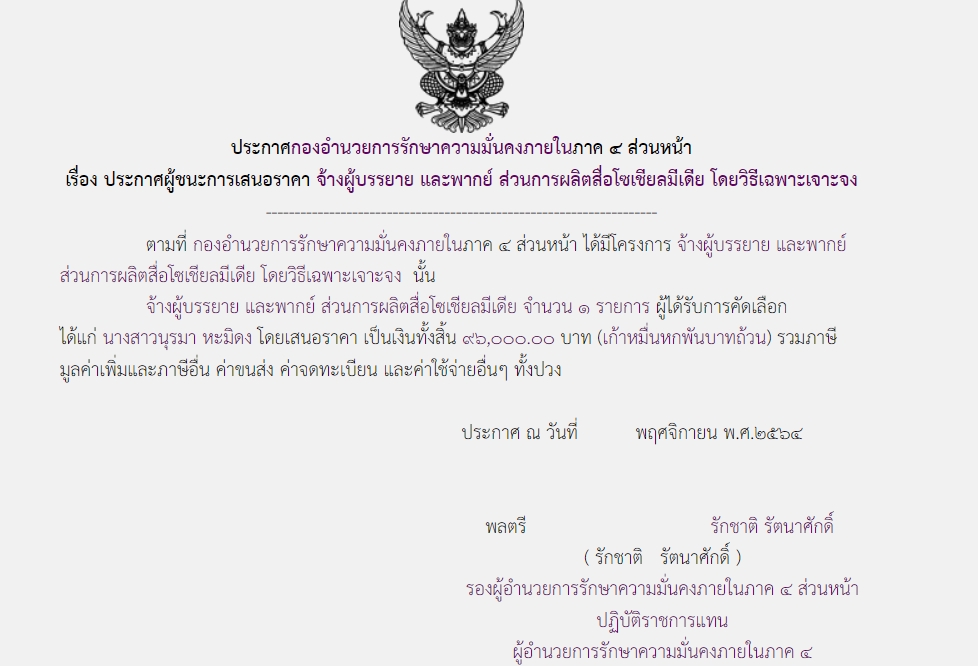 ประกาศผู้ชนะการเสนอราคา จ้างผู้บรรยาย และพากย์ ส่วนการผลิตสื่อโซเชียลมีเดีย โดยวิธีเฉพาะเจาะจง