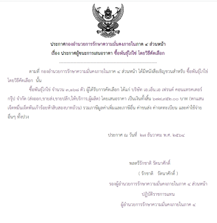 ประกาศผู้ชนะการเสนอราคา ซื้อพันธุ์ไก่ไข่ โดยวิธีคัดเลือก