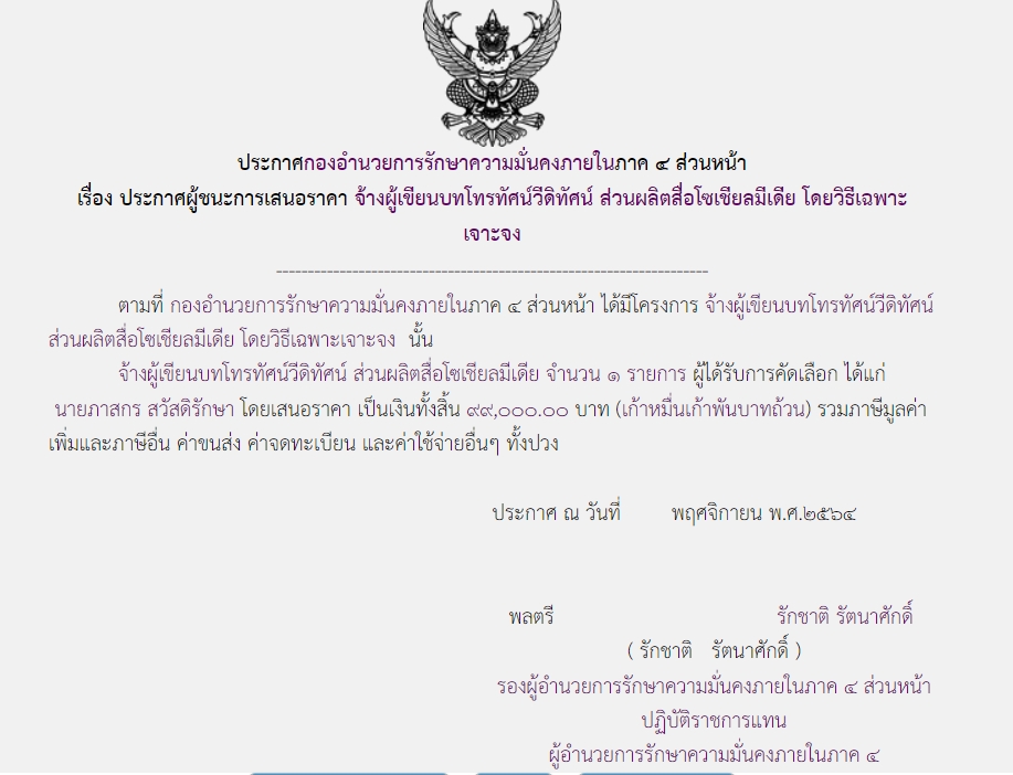 ประกาศผู้ชนะการเสนอราคา จ้างผู้เขียนบทโทรทัศน์วีดิทัศน์ ส่วนผลิตสื่อโซเชียลมีเดีย โดยวิธีเฉพาะเจาะจง